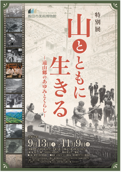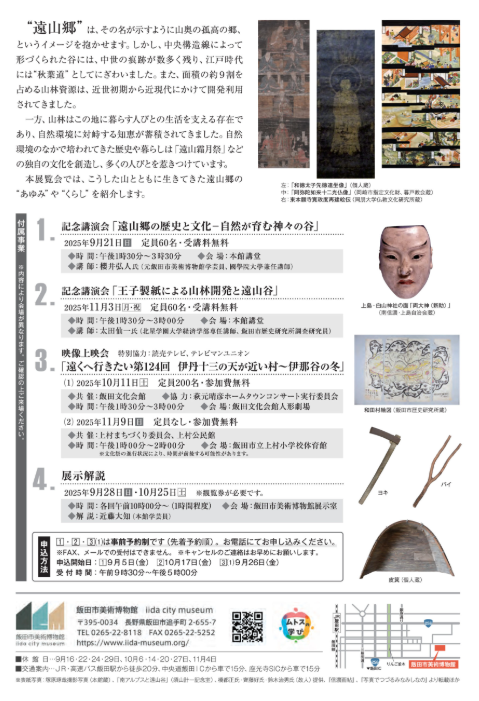 特別展「山とともに生きる-遠山郷のあゆみとくらし-」 遠山郷の山林資源は社会や人びとの暮らしを支えてきた。本展では、「山」を切り口に遠山郷の歴史と生活、文化を紹介し、今後の地域のあゆみを考える。<飯田市美術博物館HPより>