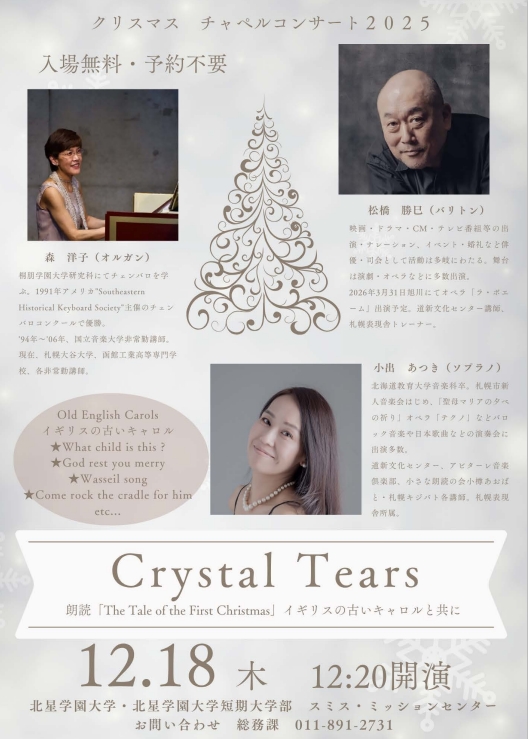 12月18日(木)12:20から、クリスタルティアーズのクリスマスチャペルコンサート『朗読「The Tale of the First Christmas」イギリスの古いキャロルと共に』を開催いたします。