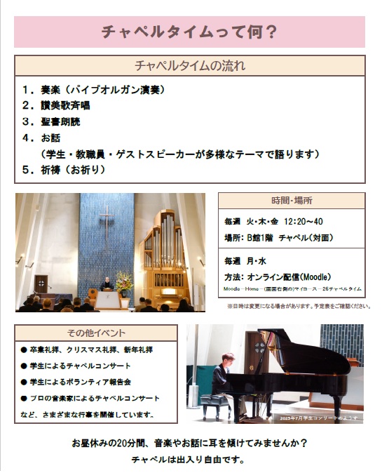月・水曜日はMoodle上での<学内限定>オンデマンド配信(札幌市内や国内にとどまらず、海外の方々のお話を聞く事ができます。月曜日はバイリンガルチャペルとし、英語のみならず様々な言語でのメッセージビデオが届きます)火・木・金曜日の12:20-12:40 は学内の教職員、学生、学外からの講話者を迎え、大学チャペルでの対面形式による礼拝を行っています(金曜日は本学英語教師陣の英語での礼拝の後、先生方とのディスカッションタイムがあります)。