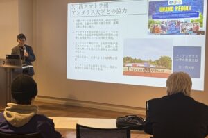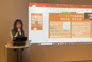 また、本学経済学科 浦野 真理子 教授とゼミ生2名から、昨年11月に発生したインドネシア・スマトラ島での豪雨災害について、被害拡大の背景にある森林減少問題、経済学部の協定校であるアンダラス大学(西スマトラ州)の救援活動、本学国際教育課と浦野ゼミが協力して実施している募金活動について紹介があり、現場に根ざした国際協力の実践と大学の役割について理解を深める機会となりました。